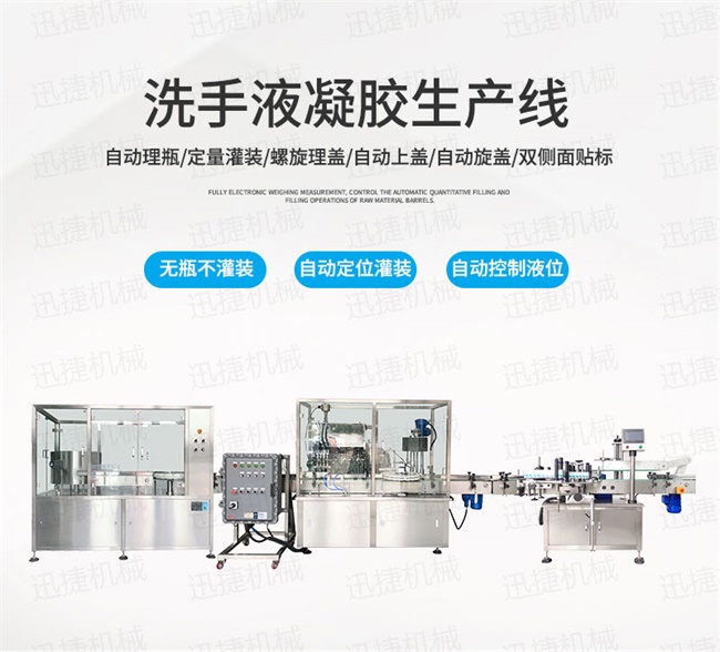 全自動(dòng)凝膠生產(chǎn)線適用于消毒凝膠、免洗手洗手液、免洗手消毒凝膠、消毒液、84消毒液、醫(yī)用酒精、75%酒精消毒液、75度酒精、消毒水、殺菌消毒劑、醫(yī)用酒精、碘酒、次氯酸鈉、劑、醫(yī)用乙醇消毒液、瓶裝消毒劑等產(chǎn)品,有多頭全自動(dòng)消毒液灌裝機(jī)和封箱機(jī)、貼標(biāo)機(jī)、打包機(jī)、噴碼機(jī)等配套設(shè)備組成,實(shí)現(xiàn)消毒液自動(dòng)灌裝,自動(dòng)旋蓋,自動(dòng)貼標(biāo),從灌裝、到成品的全部過程