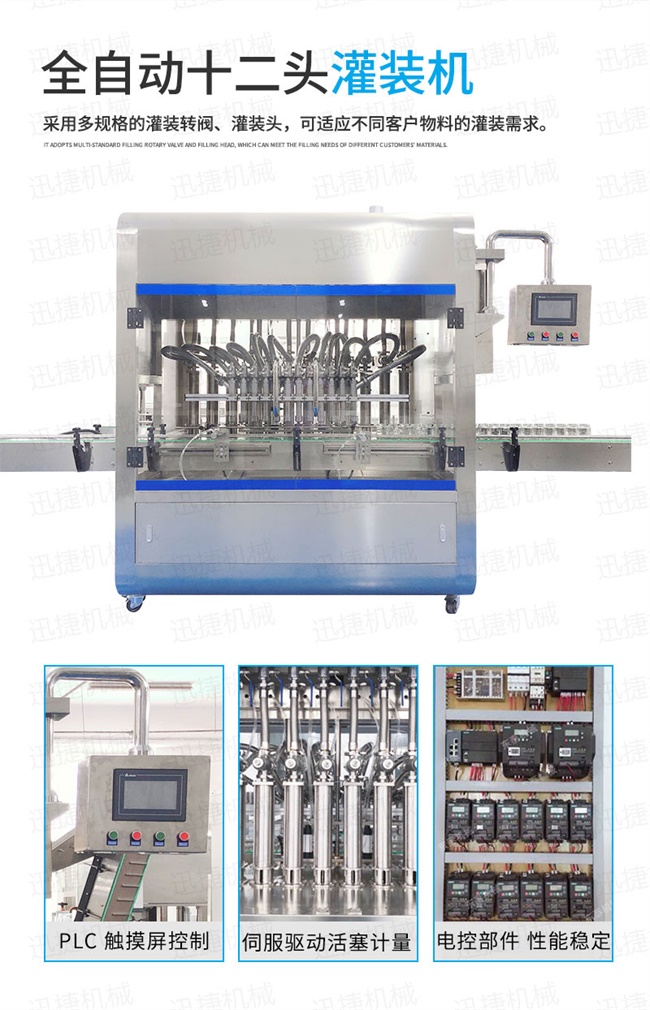 2、灌裝機(jī)以進(jìn)口PLC電腦控制、伺服驅(qū)動(dòng)計(jì)量,全彩色觸摸屏人機(jī)界面,一鍵完成計(jì)量切換確保容量之調(diào)整簡(jiǎn)易、快捷、準(zhǔn)確。是任何形式的灌裝機(jī)無(wú)法替代的;