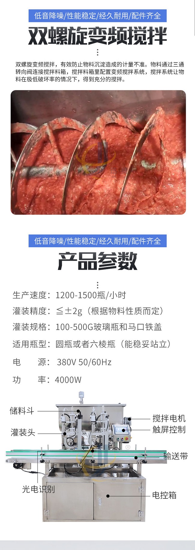 這款柱塞式辣椒醬灌裝機(jī)低音降噪、性能穩(wěn)定、經(jīng)久耐用、配件齊全,適用范圍廣泛用于辣椒醬、拌面醬、豆瓣醬、大塊肉醬、油辣醬、番茄醬花生醬、草莓醬等醬料的定量充填分裝。雙螺旋變頻攪拌,有效防止物料沉淀造成的計量不準(zhǔn)。物料通過三通轉(zhuǎn)向閥連接攪拌料箱,攪拌料箱里配置變頻攪拌系統(tǒng),攪拌系統(tǒng)讓物料在極低破壞率的情況下,得到充分的攪拌。