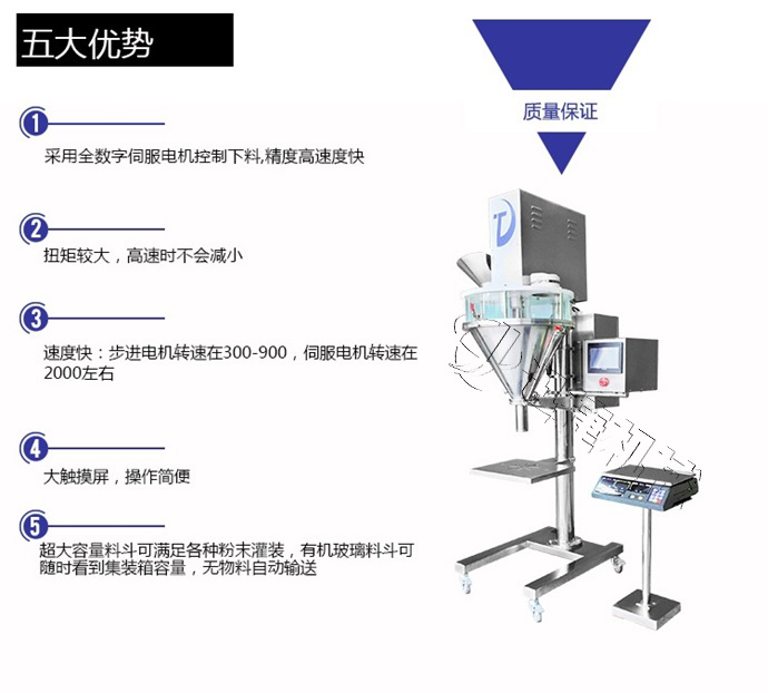 該粉劑包裝機(jī)適用于有一定流動(dòng)性的粉劑狀、顆粒狀物料,可適合袋類、罐類、瓶類等各種包裝容器粉劑定量包裝,速度快、精度高。如農(nóng)藥、獸藥、預(yù)混料、添加劑、奶粉、淀粉、調(diào)味品、酶制劑、飼料等粉劑狀、雞精、餃子粉、葡萄糖、奶粉、綠豆粉、淀粉、調(diào)味料、飼料、顆粒狀物料的定量包裝。該款半自動(dòng)粉劑包裝機(jī)在市場(chǎng)深受顧客喜愛(ài),自然有它的優(yōu)勢(shì),該設(shè)備提高工作效率、降低生產(chǎn)成本計(jì)量準(zhǔn)確、包裝規(guī)格大小均可成品干凈整潔、粉塵不外粘機(jī)器性能穩(wěn)定、使用壽命長(zhǎng)占用空間小、操作簡(jiǎn)便、移動(dòng)方便。