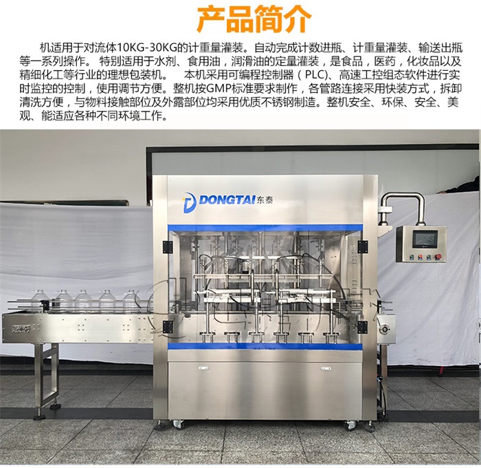 機適用于對流體5kg-30kg的計重量灌裝。自動完成計數(shù)進瓶、計重量灌裝、輸送出瓶等一系列操作。 特別適用于水劑、食用油,潤滑油的定量灌裝,是食品,醫(yī)藥,化妝品以及精細化工等行業(yè)的包裝機。本機采用可編程控制器(PLC)、高速工控組態(tài)軟件進行實時監(jiān)控的控制,使用調(diào)節(jié)方便。整機按GMP標(biāo)準(zhǔn)要求制作,各管路連接采用快裝方式,拆卸清洗方便,與物料接觸部位及外露部位均采用優(yōu)質(zhì)不銹鋼制造。整機安全、環(huán)保、安全、美觀、能適應(yīng)各種不同環(huán)境工作。