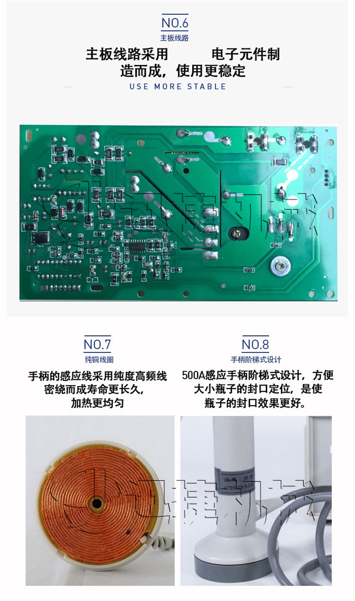 本手持式電磁感應(yīng)鋁箔封口機是利用電磁感應(yīng)的原理,將瓶口上的鋁箔片瞬間產(chǎn)生高熱,然后熔合在瓶口上,使達到封口的功能。具有良好的防潮、防霉、防偽作用,起到延長物品保存周期的目的。封口容器的材質(zhì)可以是聚乙(PE)、聚丙烯(PP)、聚酯(PET)、聚苯乙烯(PS)、ABS以及玻璃等,不能用于金屬瓶體及瓶蓋。(本公司同時提供各種材料感應(yīng)鋁箔膜)。