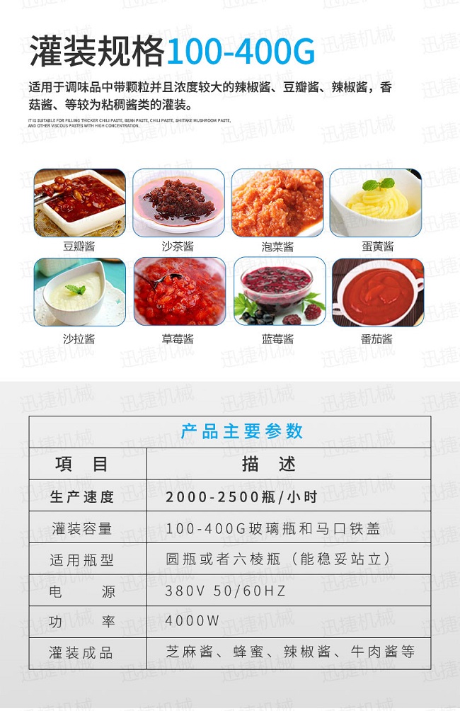 灌裝機(jī)采用活塞式灌裝原理,適用于調(diào)味品中帶顆粒并且濃度較大的辣椒醬、豆瓣醬、花生醬、香菇醬、果醬、牛油火鍋底料、紅油火鍋底料、蝦醬等較為粘稠醬類的灌裝。